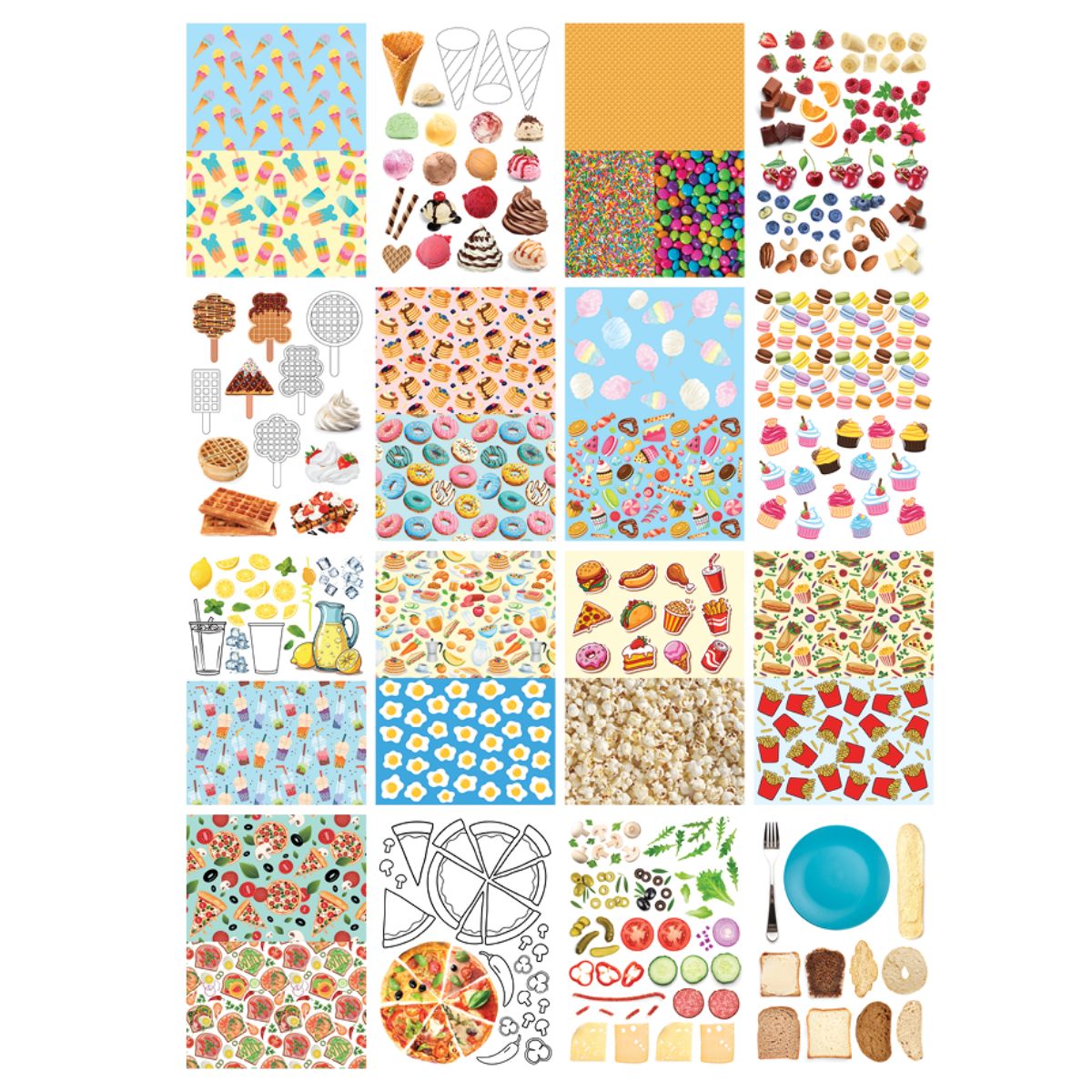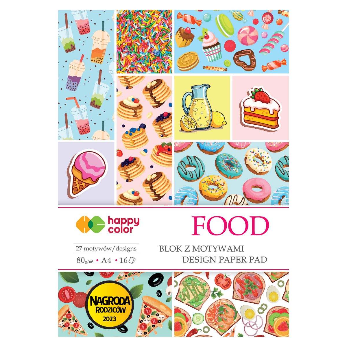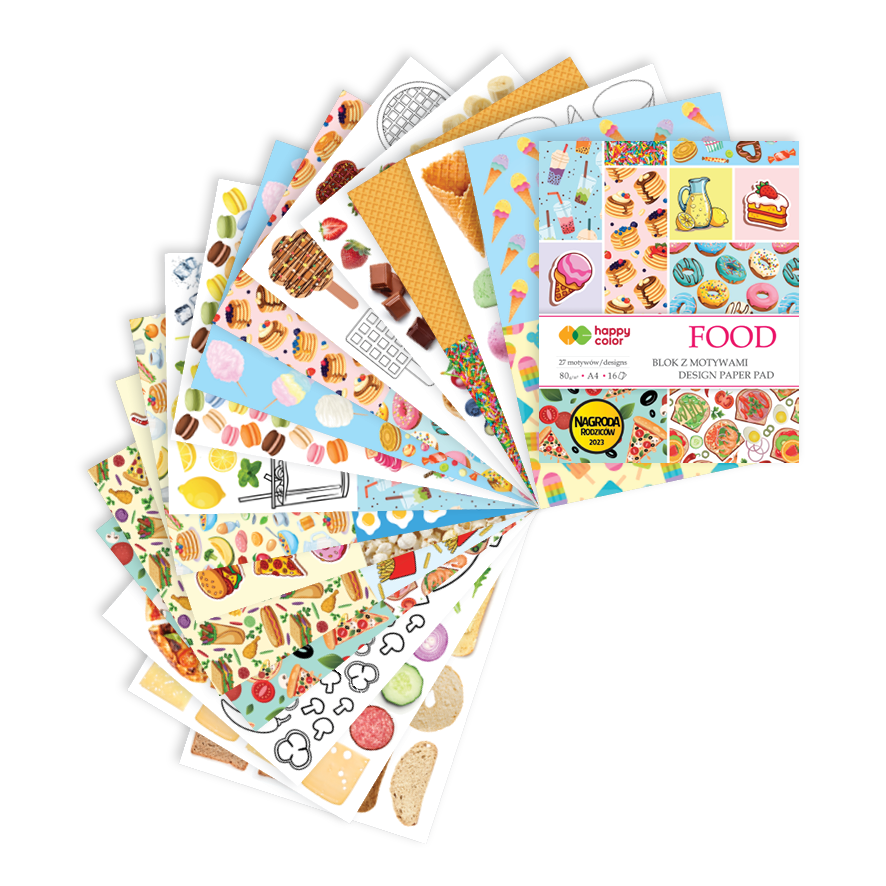 Blok kreatywny z motywami Happy Color A4 80 g 16 arkuszy 27 motywów - różne motywy związane z jedzeniem