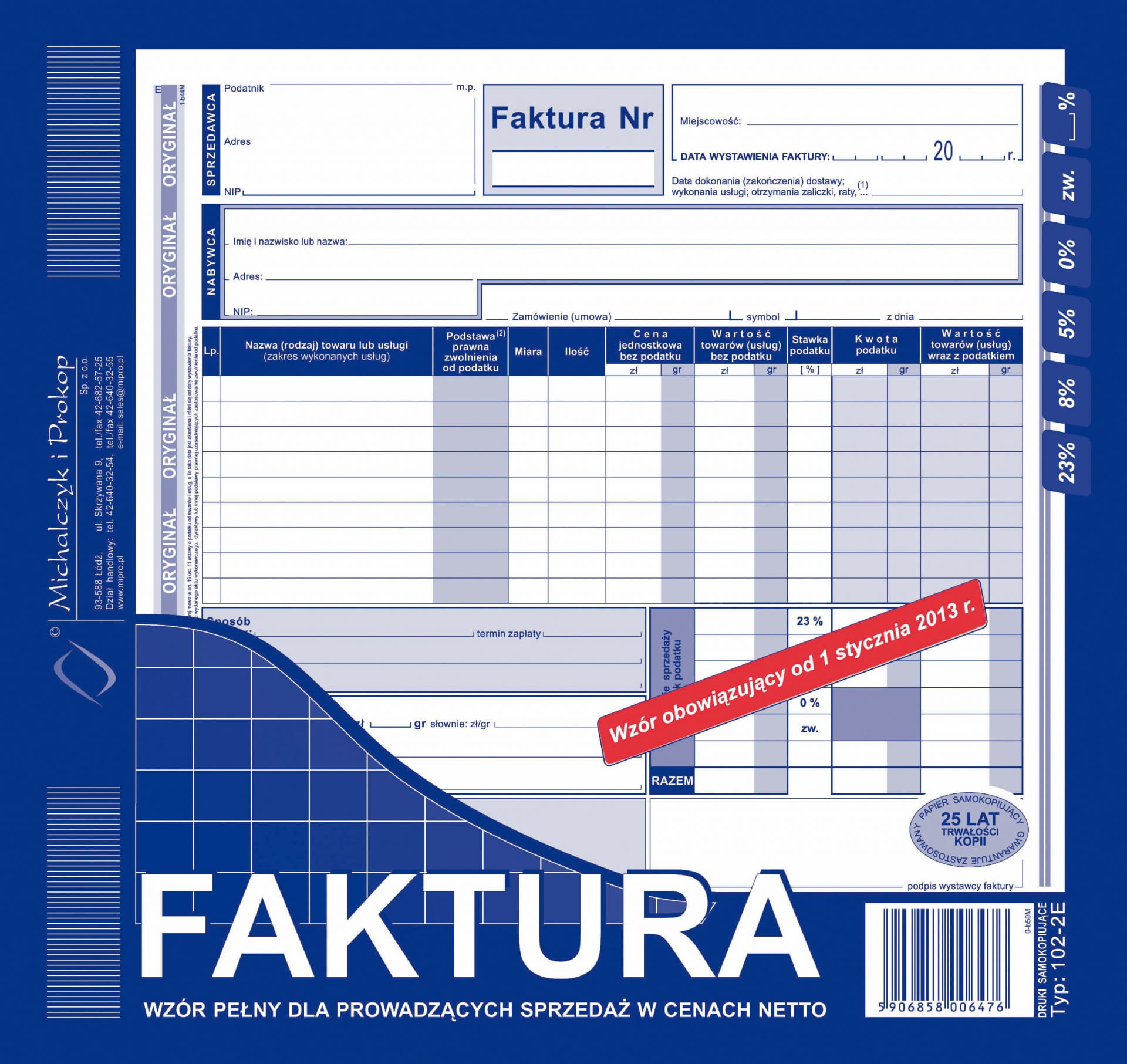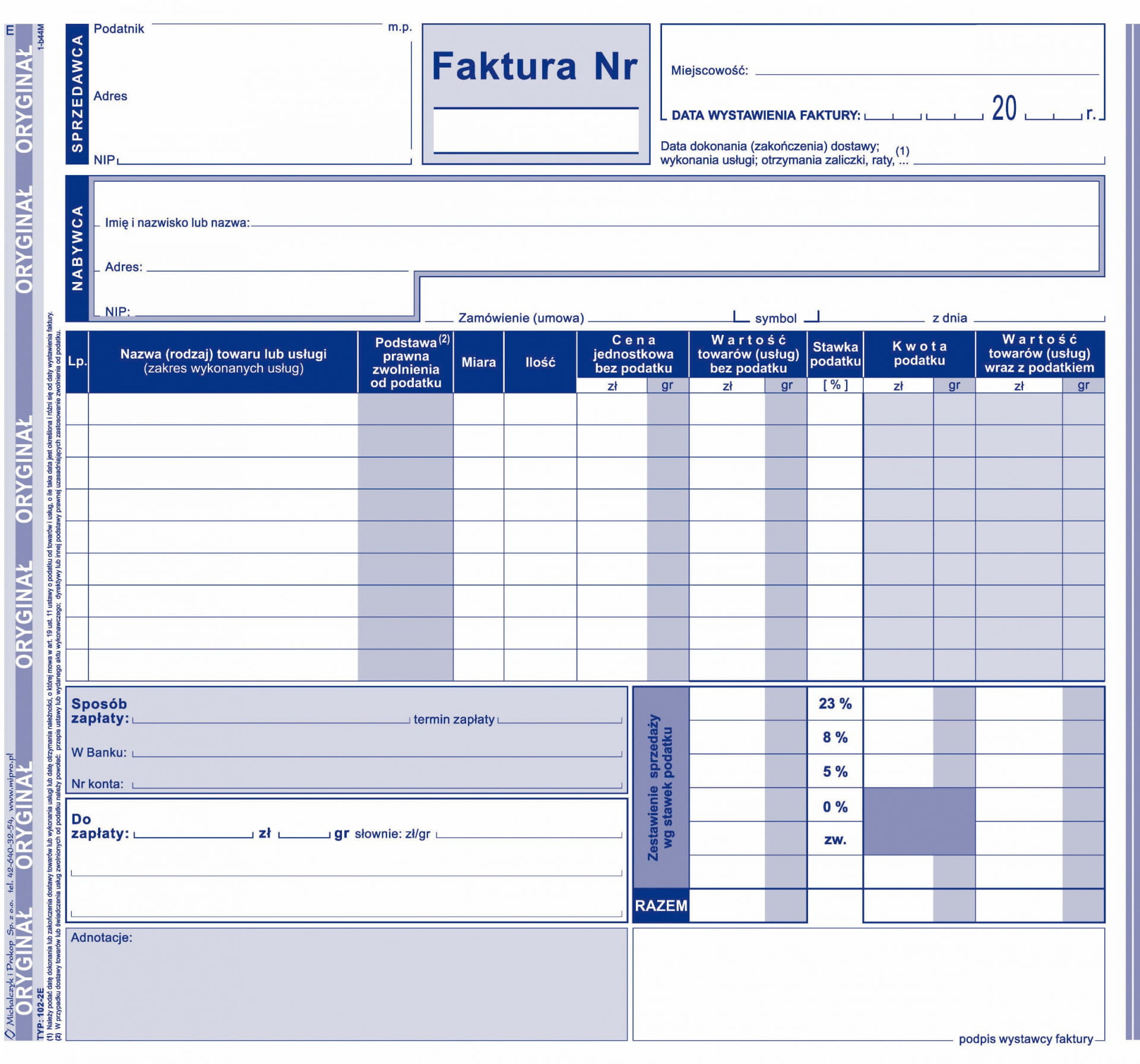 Druk 102-2E FAKTURA Wzór pełny dla prowadzących sprzedaż w cenach netto 1+1 2/3 A4