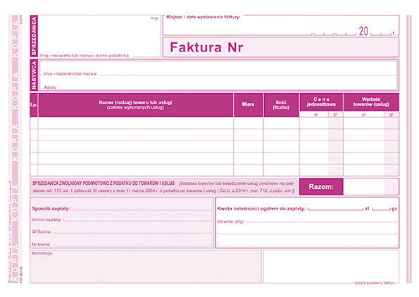 Faktura dla podatników zwolnionych podmiotowo z podatku od towarów i usług 203-3E
