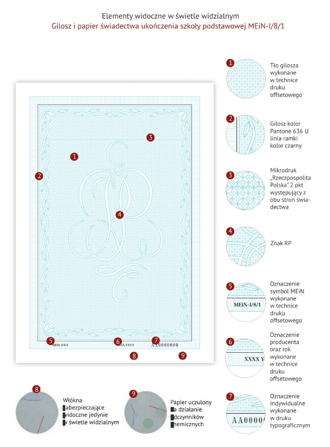 Gilosz w kolorze niebieskim Pantone 636 U z biało-czerwonym paskiem z zabezpieczeniami (papier specjalny, UV, numeracja) do nadruku świadectw ukończenia szkoły podstawowej, z wyróżnieniem.