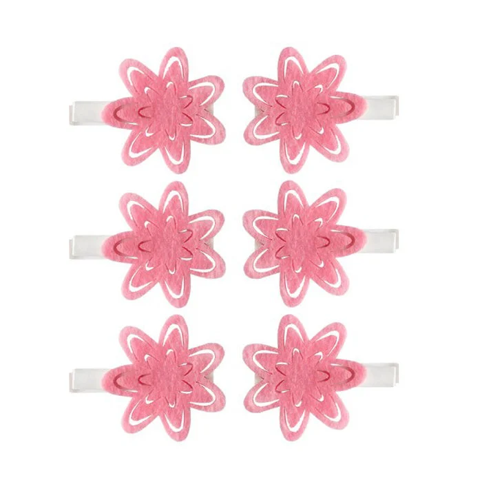 Ozdobne klamerki drewniane w białym kolorze z filcową ozdobą w postaci różowego kwiatka - 6 sztuk