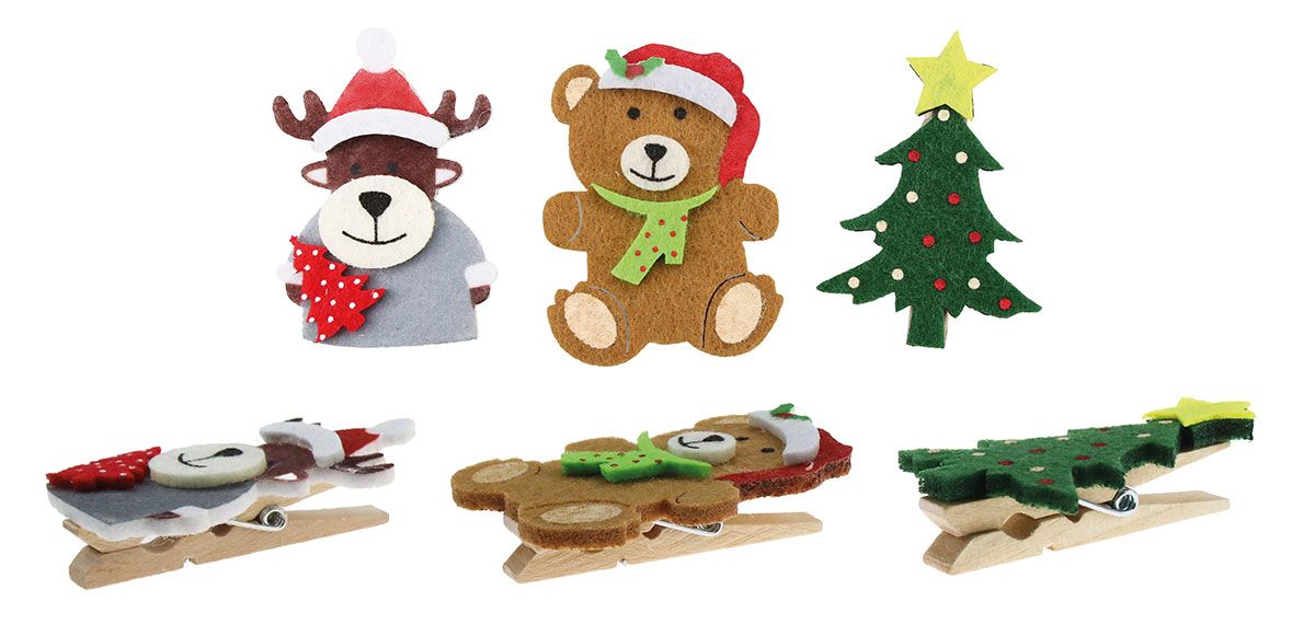 Klamerki dekoracyjne drewniane 4,8-5,4 cm - choinki, renifery, misie - 6 sztuk