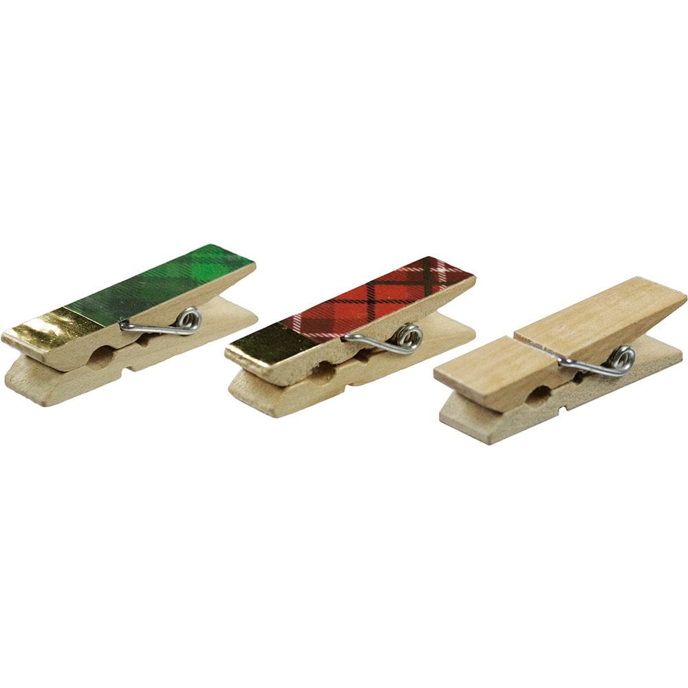 Drewniane klamerki z dekoracyjną naklejką w kratę. Doskonałe do zdobienia kartek okolicznościowych, pudełek i torebek na prezenty, produktów oprawy ślubnej oraz produktów do wystroju wnętrza.