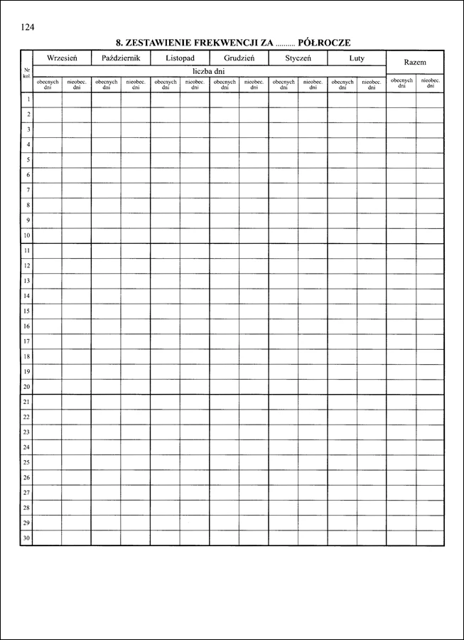 Dziennik bez podziału godzinowego, z frekwencją dzienną, oprawa twarda, 140 stron, zakładka na 30 uczniów.