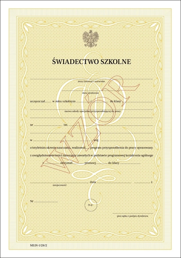 MEiN-I/28/2 Świadectwo szkolne promocyjne - szkoła specjalna przysposabiająca do pracy