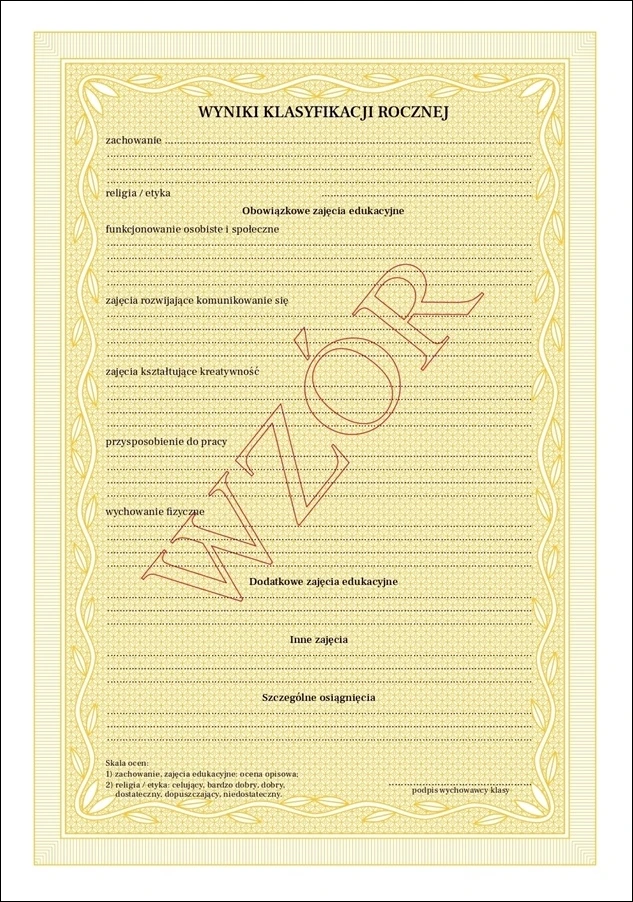 Świadectwo promocyjne w kolorze żółtym Pantone 123 U dla uczniów szkoły szkoły specjalnej przysposabiającej do pracy. Papier o podwyższonej gramaturze 90 g/m2, format A4 (2 strony).
