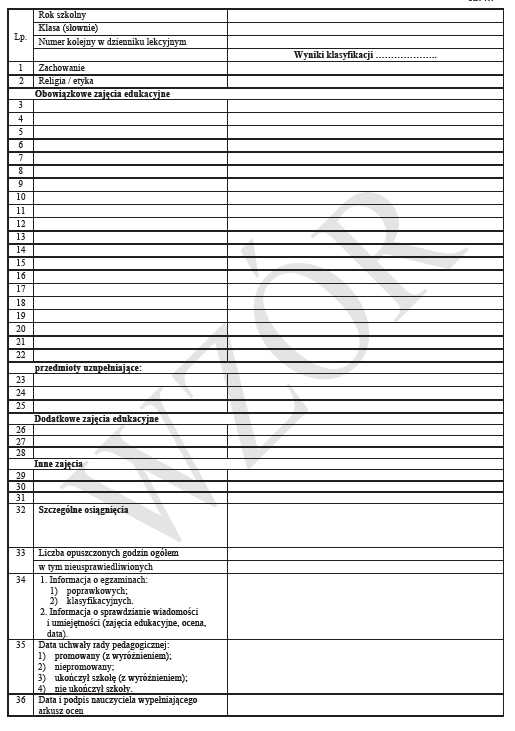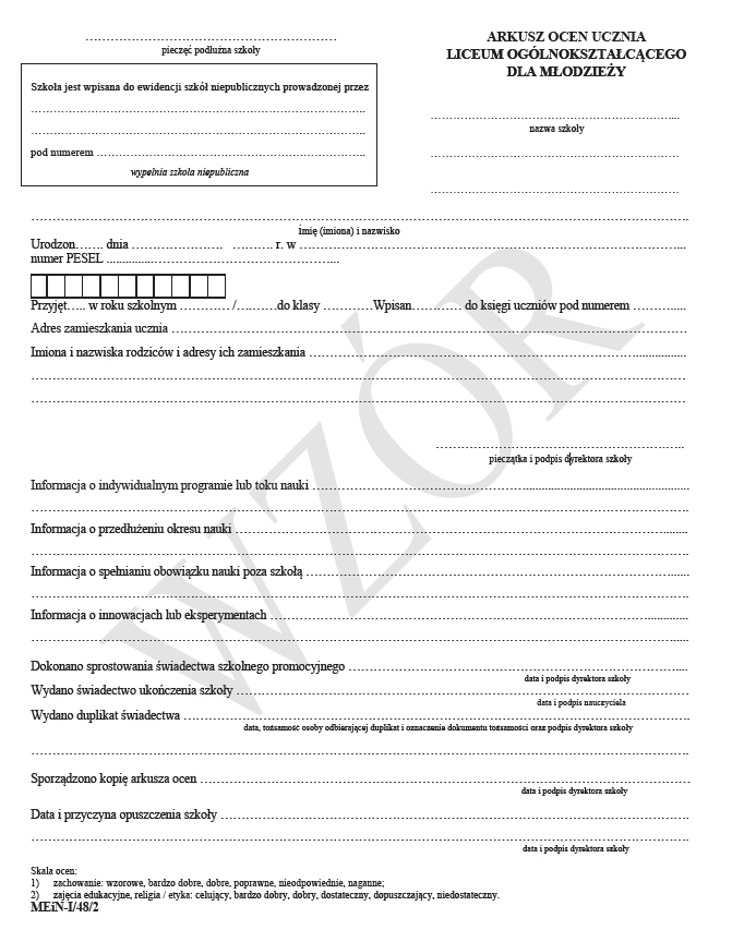 MEiN-I/48/2 Arkusz ocen dla uczniów liceum ogólnokształcącego