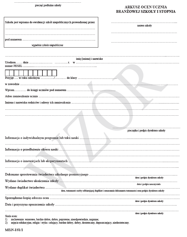 MEiN-I/51/2 Arkusz ocen dla uczniów branżowej szkoły I stopnia
