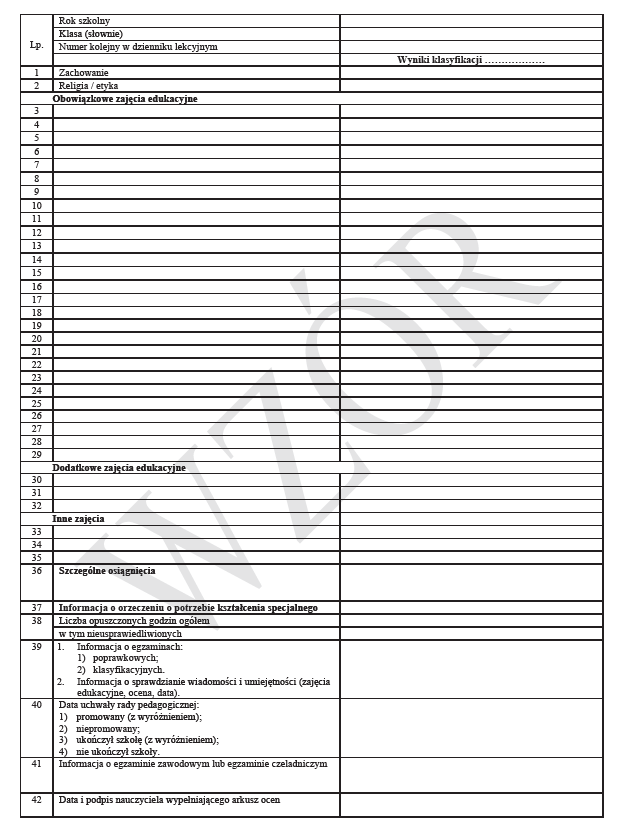 W ofercie dostępny również Arkusz ocen do wypełniania pismem ręcznym MEiN-I/40/2 (format A4, 6 stron w cenie 1,10 zł brutto za 1 szt.)