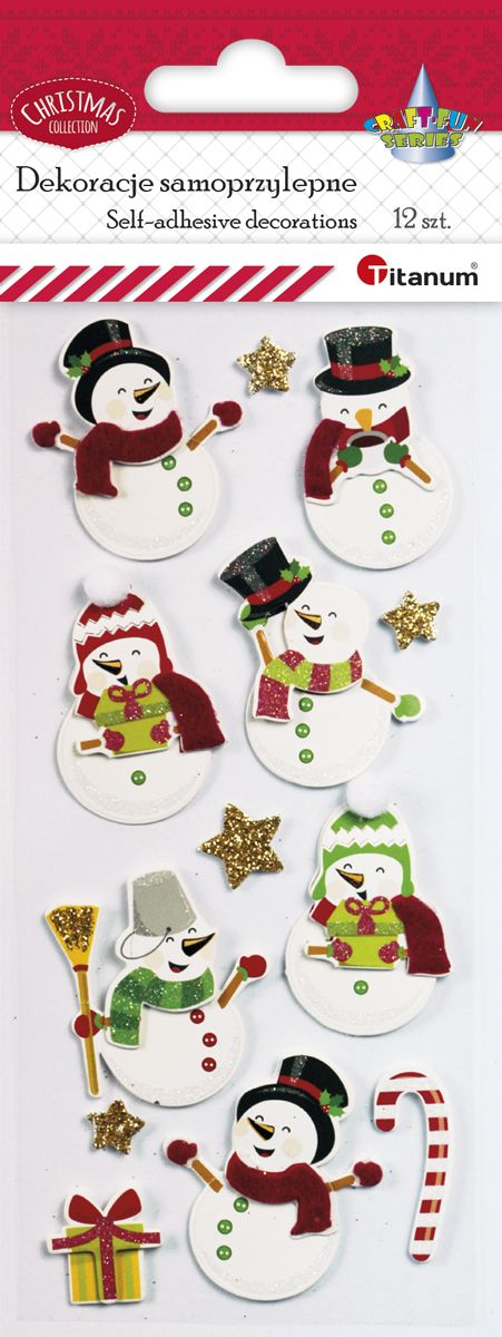 Naklejki papierowe na taśmie, 8 wzorów zimowych - Bałwanki. 250 sztuk. Idealne do ozdabiania prezentów czy kartek świątecznych.