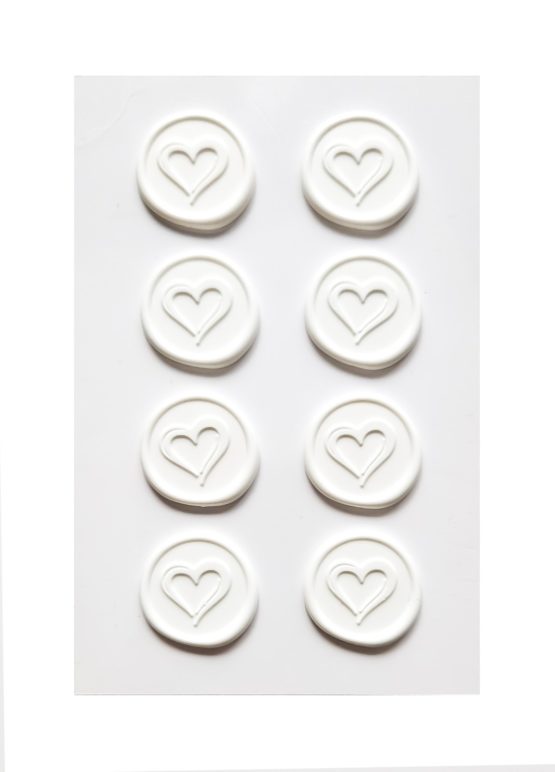 Zdobione motywem serca. 8 sztuk pojedynczych naklejek w formie odbicia lakowego. Doskonałe do zdobienia kartek okolicznościowych, pudełek i torebek na prezenty, kopert.