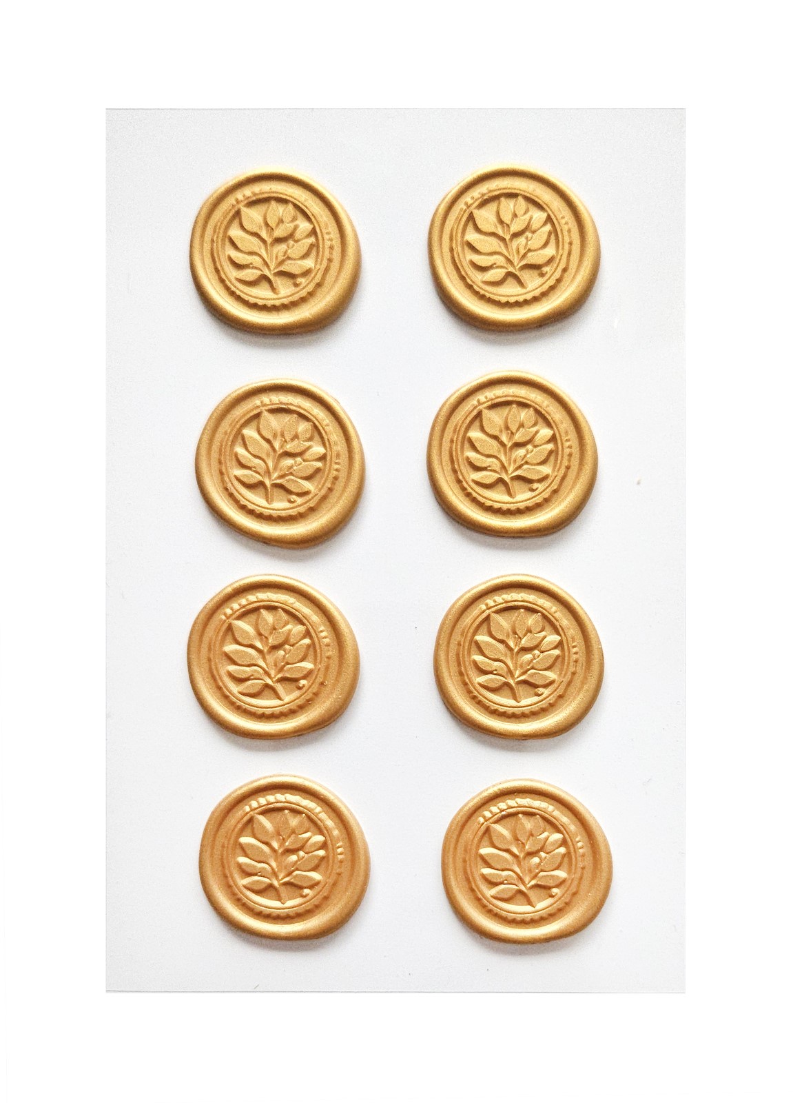 Zdobione motywem listków. 8 sztuk pojedynczych naklejek w formie odbicia lakowego. Doskonałe do zdobienia kartek okolicznościowych, pudełek i torebek na prezenty, kopert.
