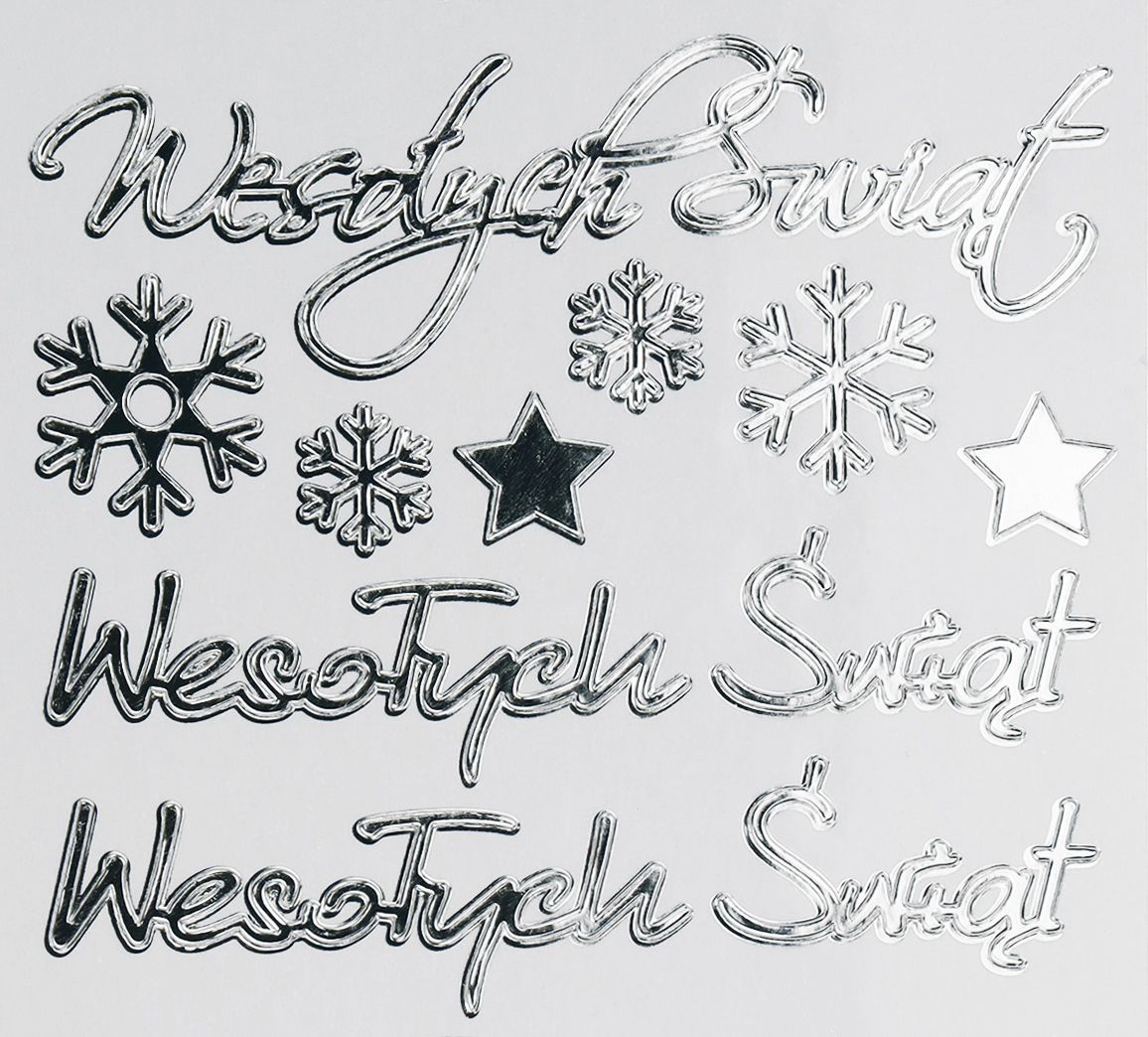 Naklejki foliowe, wzory: napisy „Wesołych Świąt” 2 rodzaje 10 sztuk + gwiazdki 2 sztuki + płatki śniegu srebrne 4 sztuki, srebrne.