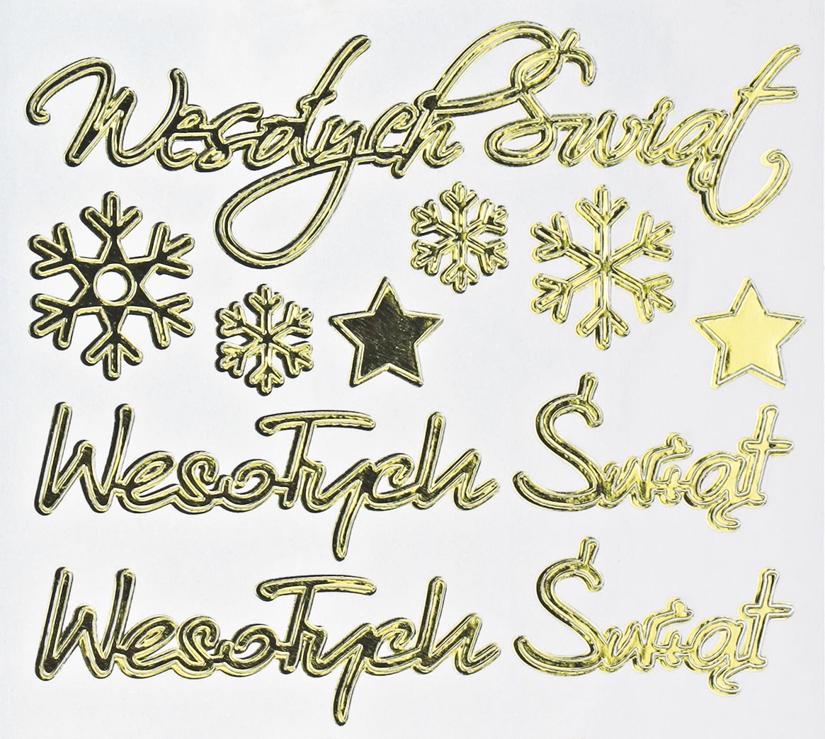 Naklejki foliowe, wzory: napisy „Wesołych Świąt” 2 rodzaje 10 sztuk + gwiazdki 2 sztuki + płatki śniegu srebrne 4 sztuki, złote.