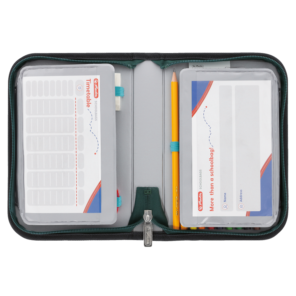 Piórnik szkolny dwuklapkowy z wyposażeniem Herlitz Green Rex - tyranozaur