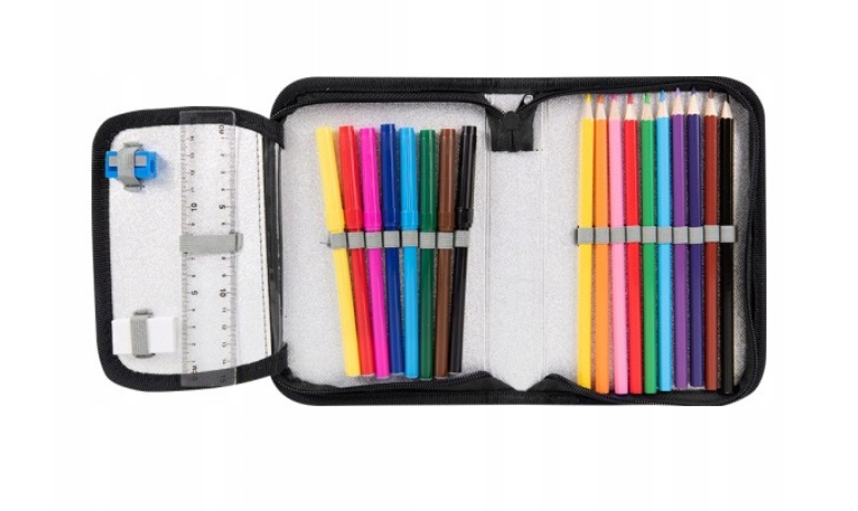 Piórnik zamykany jest na zamek. W środku posiada dodatkową przekładkę na przybory szkolne.