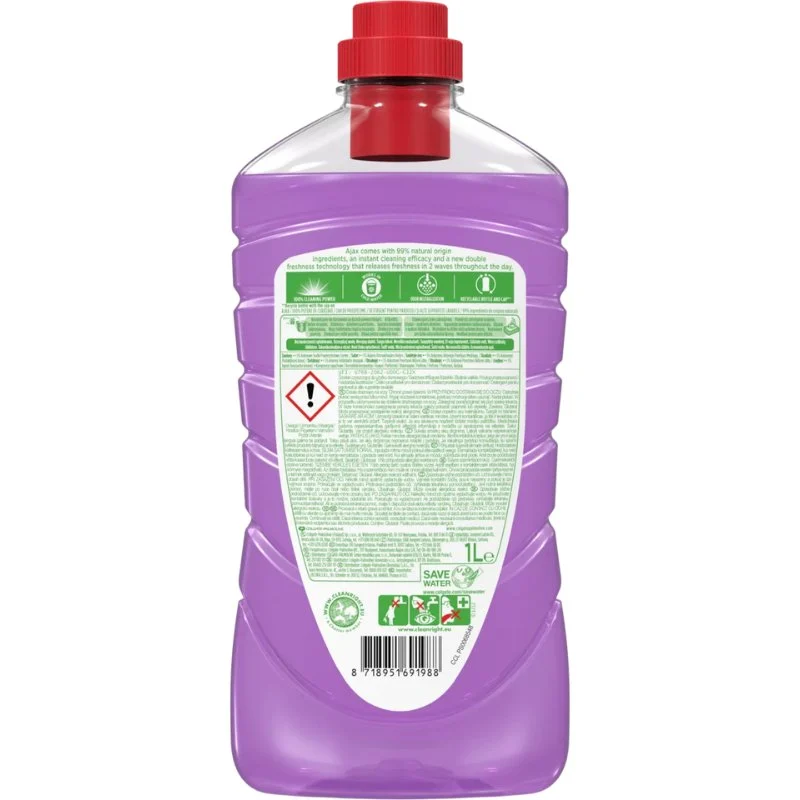 Ajax uniwersalny płyn do mycia Ultra Lawenda to doskonały wybór dla tych, którzy cenią sobie skuteczność i świeżość w codziennym sprzątaniu. Dzięki unikalnej formule, skutecznie radzi sobie z wszelkimi zabrudzeniami, pozostawiając powierzchnie lśniąco czyste i pięknie pachnące lawendą.