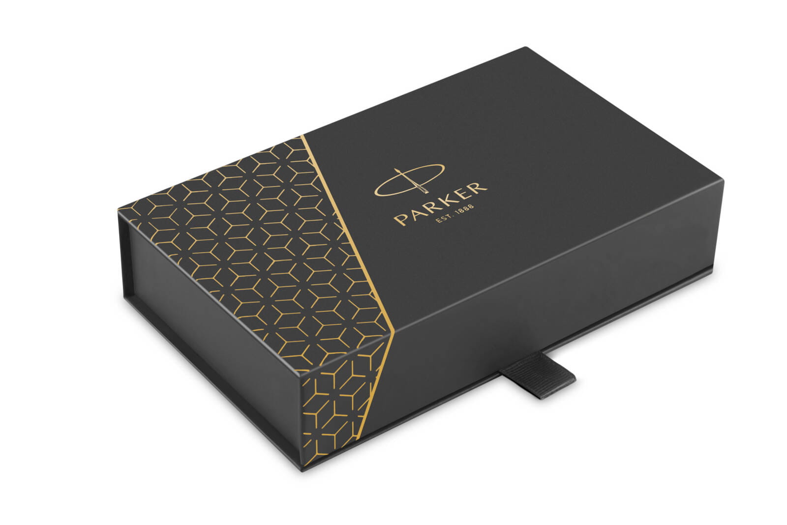 Eleganckie pudełko prezentowe na produkty piśmiennicze, wraz z czarnym etui ze skóry naturalnej. Jest to oryginalne pudełko Parker w srebrnym kolorze, ozdobione dodatkowo obwolutą oraz wygrawerowanym na jego powierzchni logo marki. Pudełko to stanowi ozdobę samą w sobie. Nie wymaga dodatkowego pakowania, podkreślając markę, a tym samym wyjątkowość prezentu.