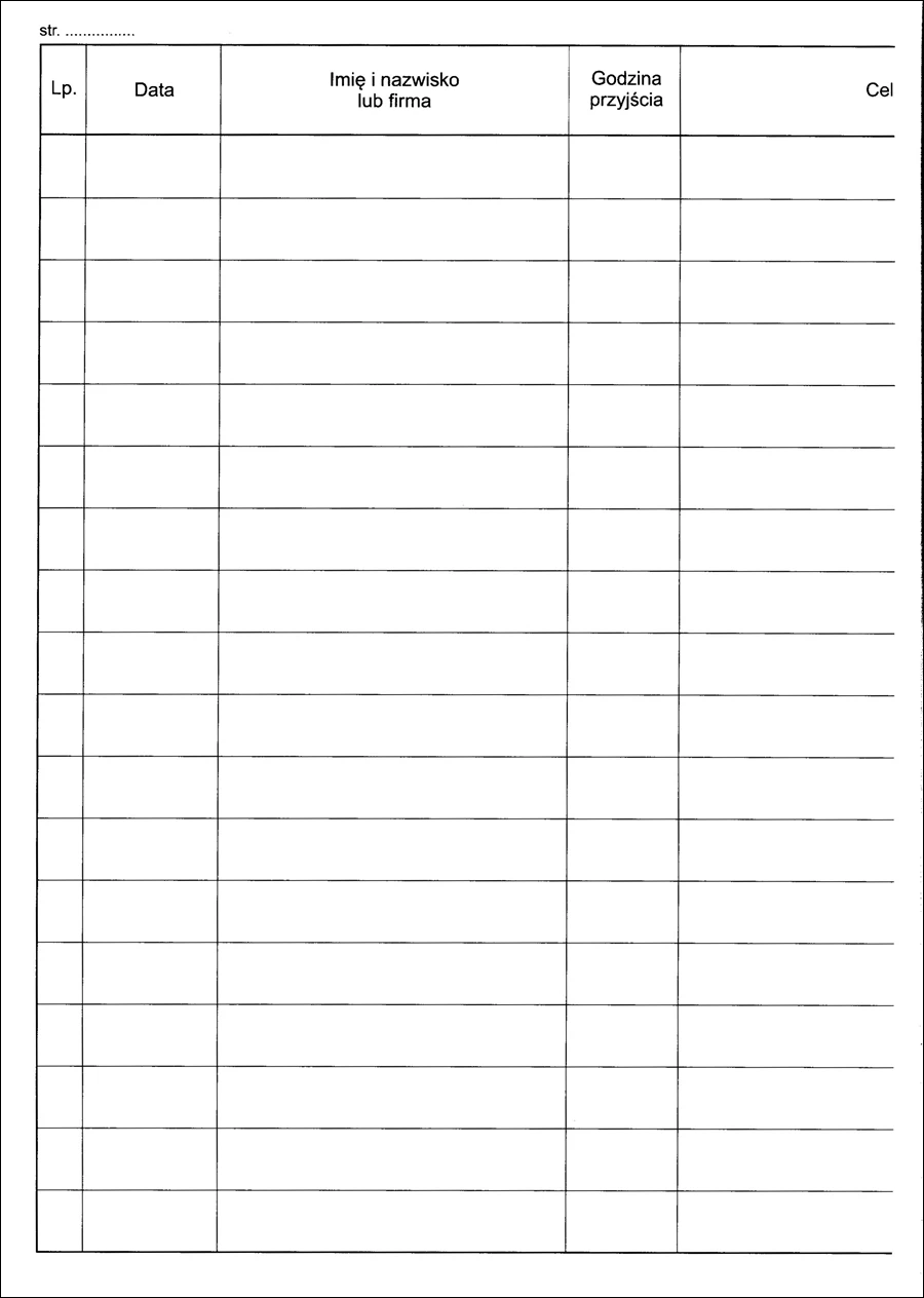 Kolumny: Lp. / Data / Imię i nazwisko lub firma / Godzina przyjścia / Cel wizyty / Podpis / Godzina wyjścia / Podpis / Uwagi