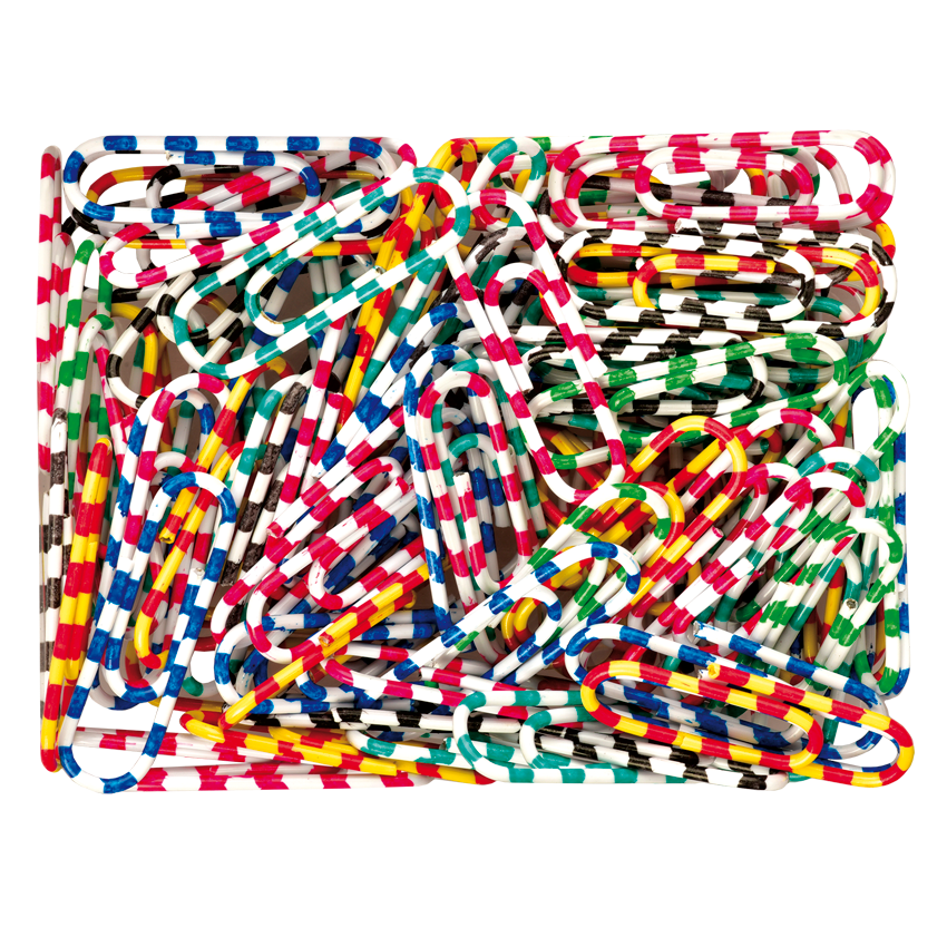Spinacze biurowe o okrągłym kształcie, stalowe pokryte kolorowym plastikiem dwukolorowym typu „zebra”.