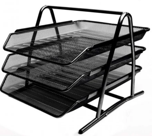 Półka biurowa na dokumenty wykonana z metalowej siatki pokrytej stylowym czarnym lakierem. Solidna, ergonomiczna i kompaktowa, zaokrąglona budowa ułatwiająca przenoszenie produktu. Idealne miejsce na wszystkie pilne i ważne dokumenty.