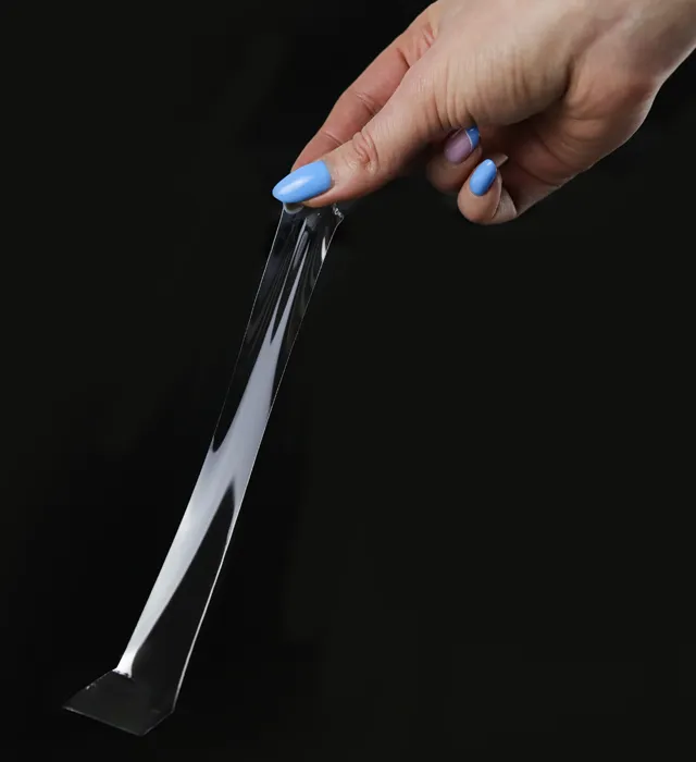Krystalicznie przejrzysta taśma do estetycznego mocowania przezroczystych elementów. Stworzona w całości z kleju z warstwą zabezpieczającą, a nie jak tradycyjne taśmy dwustronne: z nośnika pokrytego warstwą kleju; dzięki temu rozciąganie taśmy nie zmniejsza jej właściwości przyczepnych.