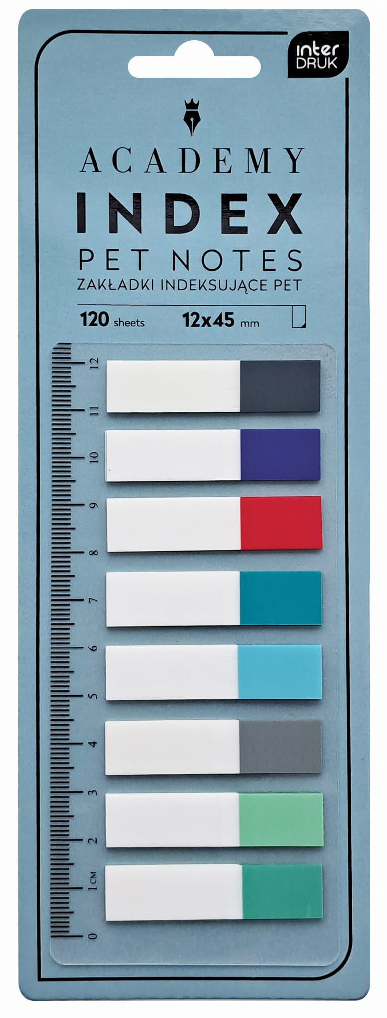 Zakładki indeksujące Interdruk PET proste z linijką Academy 12 x 45 mm - 8 kolorów - 120 sztuk