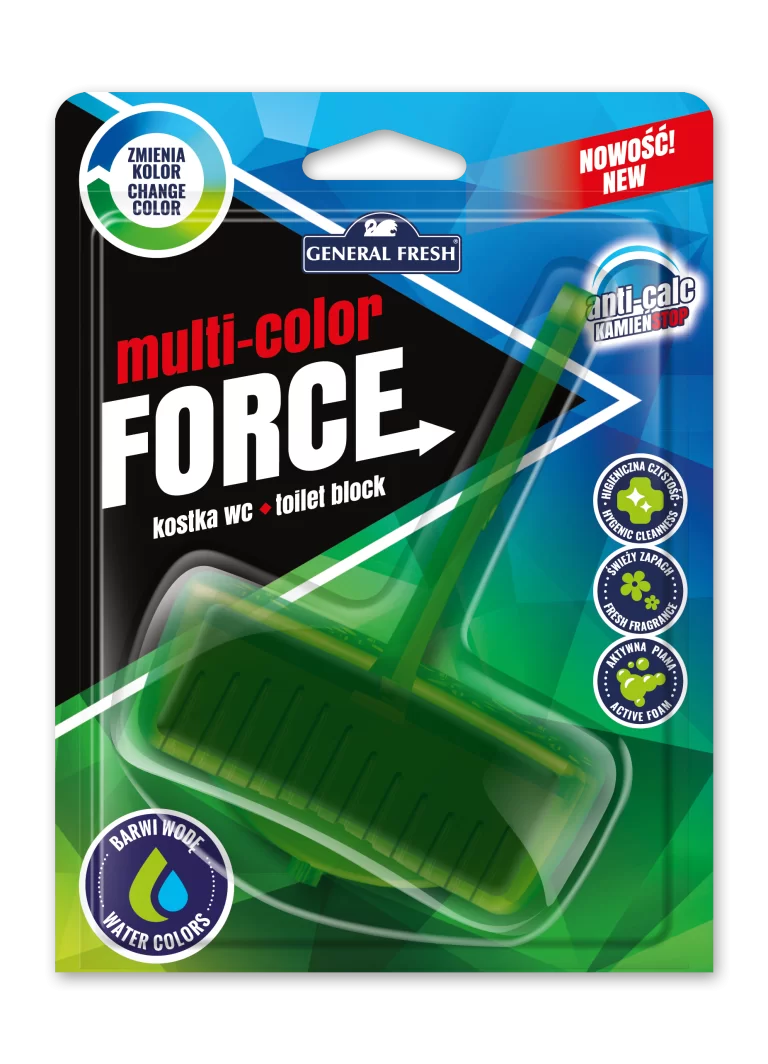 Zawieszka do WC barwiąca wodę – Multi-Color Force zadba o nieskazitelną czystość w toalecie. Dzięki eliminującej kamień technologii anti-calc oraz aktywnej pianie, usuwa zanieczyszczenia, gromadzące się w muszli klozetowej.