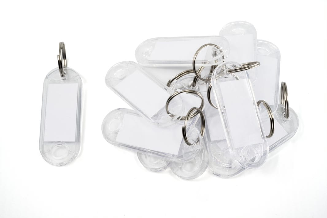 Dwustronne identyfikatory do kluczy z zawieszką, z okienkiem do wpisania numerów/nazw pomieszczeń.