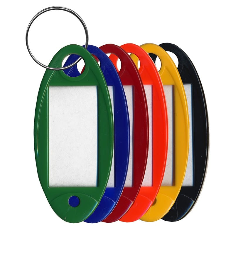 Jednostronne identyfikatory do kluczy z zawieszką, z okienkiem do wpisania numerów/nazw pomieszczeń.