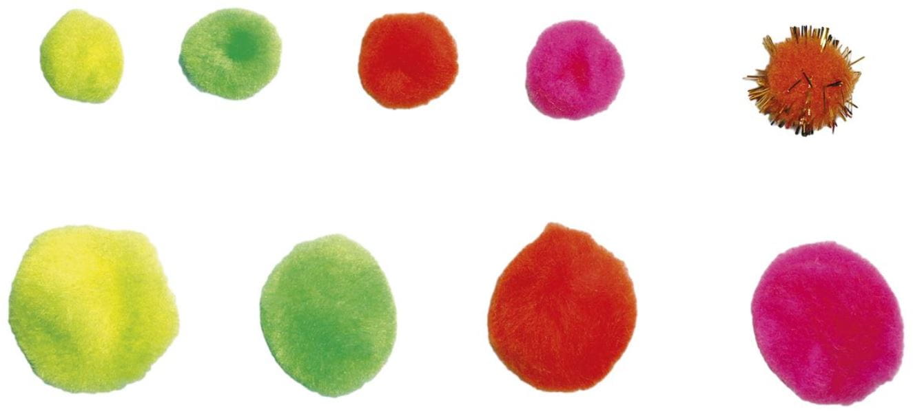 Zestaw oczek, drucików i pomponów w neonowych odcieniach - żółty, pomarańczowy, różowy, zielony.