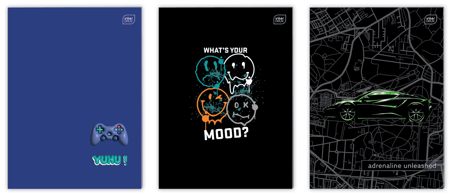 - Zeszyty w intensywnych kolorystycznie grafikach, zaprojektowane zgodnie z aktualnymi trendami w designie i modzie.