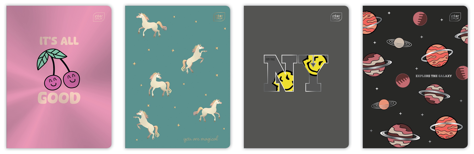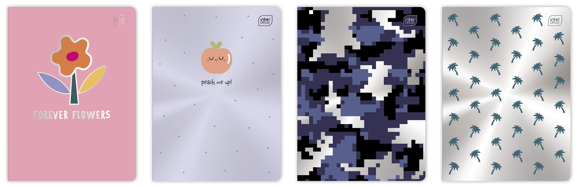 Miękkie, kartonowe okładki w różnych kolorach i różnymi motywami w metalicznych kolorach. Lekkie zeszyty stanowią doskonałe wyposażenie plecaków wszystkich najmłodszych uczniów. Liniatura w podwójną kolorową linie ułatwia naukę pisania.