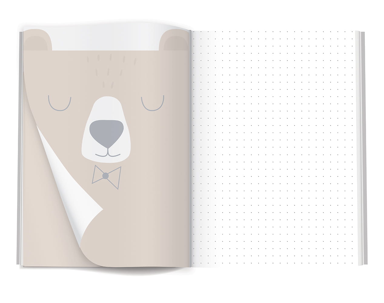 W środku jedna strona pokryta kropkami ułatwiającymi pisanie, druga strona gładka z wizerunkiem zwierzaka z okładki.