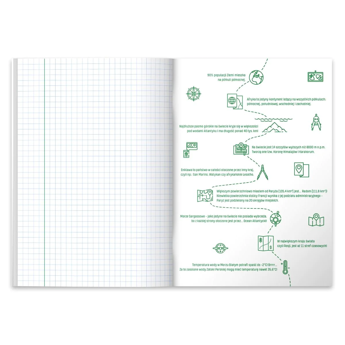 - Jasna niebieska liniatura + zielony margines.